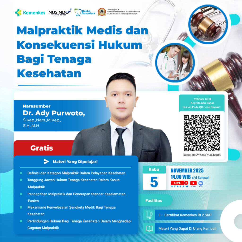 WEBINAR GRATIS "Malpraktik Medis dan Konsekuensi Hukum Bagi Tenaga Kesehatan" Sebesar 2 SKP Kemenkes RI